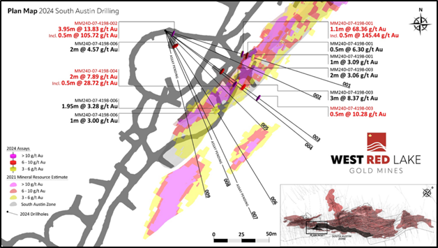FIGURE 3. South Austin plan view drill section showing assay highlights for Holes MM24D-07-4198-001 through -006.[1]