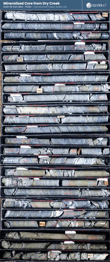 ). Mineralized core from drill hole DC25-110 at the Dry Creek deposit showing d