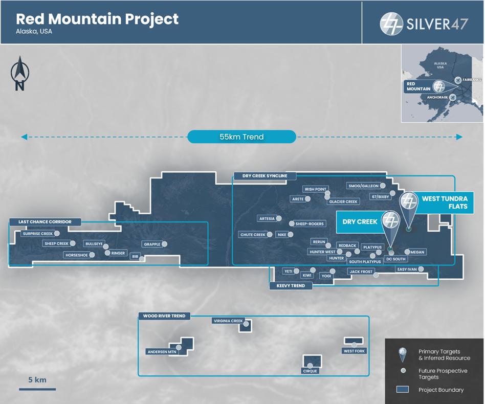 Figure 1. Plan Map of Red Mountain Project showing over 35 targets highlighting the Dry Creek and West Tundra Flats target.