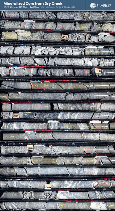 ). Mineralized core from drill hole DC25-113 at the Dry Creek deposit showing d