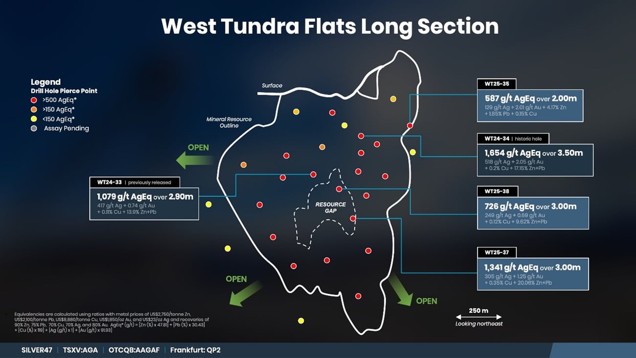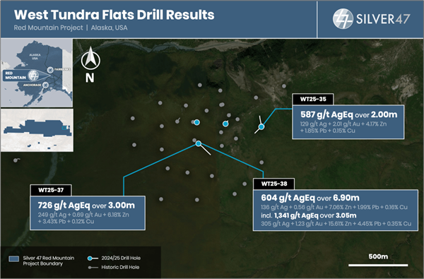 Holes WT25-35 to WT25-38 were collared as 150-175 offsets from previously drilled holes in the West Tundra Flat Deposit (e.g., 1,079 g/t silver equivalent (417.4 g/t Ag, 0.74 g/t Au, 9.1% Zn, 4.7% Pb and 0.1% Cu) over 2.9 m in WT24-33, see November 21st, 2024 News Release). All holes except WT25-36 intersected semi-massive to massive sulfide at the targeted horizon (e.g. sphalerite, galena and
