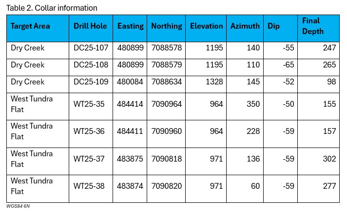 Based on results from drill holes DC25-107 and 108 at Dry Creek and WT25-33 to 39 at West Tundra Flat together with