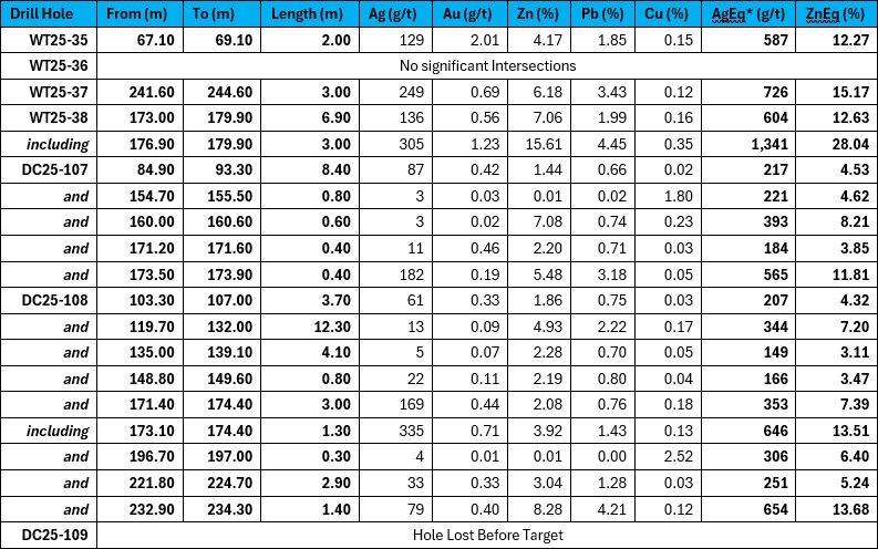 - 736 g/t silver equivalent over 3.0 m (249 g/t Ag, 0.69 g/t Au, 6.16% Zn, 3.43% Pb and 0.12% Cu) in a 165 m step-out in WT25-37
