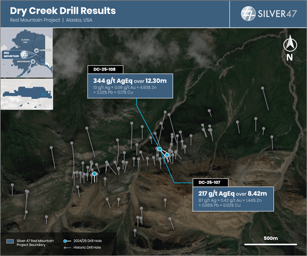 were collared on the northeast extent of the Dry Creek deposit and tested the down-dip extent of VMS mineralization below and offset from hole DC24-106. Hole DC24-106, drilled in 2024, intersected multiple massive sulfide horizons within a significant 24.5 m semi-massive mineralized zone (e.g., 2,939 g/t silver equivalent (249.5 g/t Ag, 14.95 g/t Au, 21.97% Zn, 7.03% Pb and 0.42% Cu) over 2.48 m and 2,235 g/t silver equivalent (225 g/t Ag, 8.08 g/t Au, 21.2% Zn, 6.68% Pb and 0.42% Cu) over 0.91