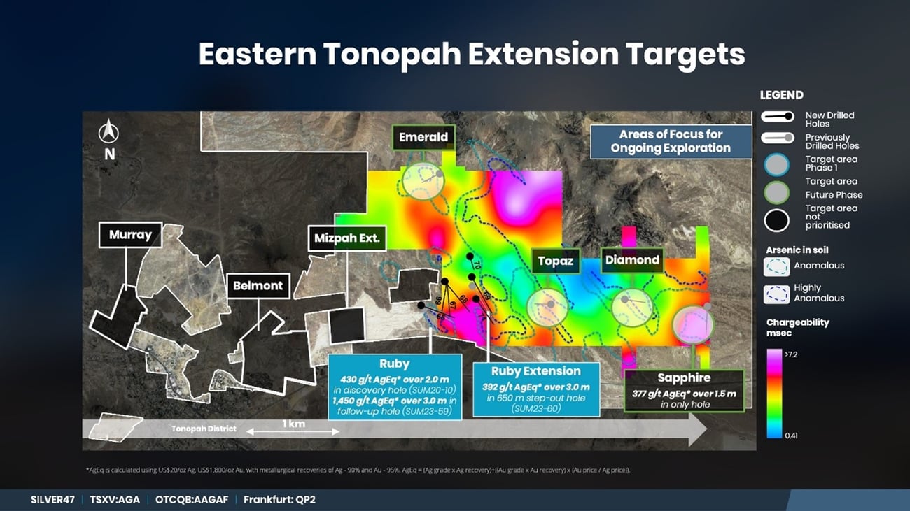- Significant Discovery Potential: Mineralization extends over a 4 km strike length east of the historic Tonopah Mining District, open in all directions, with strong alteration suggesting proximity to a major mineralized structure.
