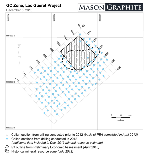 Future Mineral Growth Potential The new mineral resource estimate is based on drill data from the GC Zone, which represents only one of two mineralized zones identified on the Lac Guéret property to date. GC Zone A total of 170 holes totalling approximately 26,500 metres have been drilled in this area. The GC Zone has a strike length of approximately 1.2 kilometres and the new mineral resource estimate has almost doubled the width of the deposit to about 600 metres. The mineral envelope remains open in all directions and the company expects further growth with additional drilling. GR Zone To date, only 18 holes totalling approximately 2,300 metres have been drilled in this zone, which is located less than one kilometre north of the GC Zone. The GR Zone is currently defined on an area spanning about 1 kilometre by 110 metres. Mineral Resource Estimation Methodology The Mineral Resource estimation for the GC Zone is based on geological observations and geochemical data modelization involving the following rock subdivisions: Unit 1 is defined by a content of 5-10 % Cg; Unit 2 by 10-25 % Cg; and Unit 3 by 25 % Cg or more. Waste has less than 5 % Cg. Units 1 and 2, appearing similar in texture, have been regrouped during the interpretation. Unit 2 now ranges from 5 to 25 % Cg. The GC Zone database includes 4 channels sampled trenches (approximately 900 meters) in addition to 170 NQ size diamond core holes drilled prior to December 15th, 2012 (approximately 26,500 meters) for a total of 18,182 samples. Resources were classified as Measured, Indicated or Inferred based on information spacing and the confidence to the geological continuity of mineralization in accordance to the CIM guidelines. Only material located within a pit shell generated from an optimized mining scenario run under Whittle software is included in this mineral resources estimate. This scenario is assuming an overall pit slope of 45°, an operating cost of $69.00 US per tonne milled (including mining and milling costs), a 100 % mining recovery, no mining dilution and a conservative selling price of $1,525 US/tonne of concentrate at 93.7 % Cg. Drill holes cross sections and plan views were interpreted to construct three-dimensional wireframe models using the geochemical analyses and geological descriptive logs with a nominal cut-off of 5% Cg under GEMS software. No capping value was applied to the assays. Assay intervals were composited to 3 meter lengths from the raw Cgr assay values and grades were estimated using ordinary Kriging. Search ellipsoids were defined in a plane that parallels the average bedding trend characterized by an azimuth of 50o and a plunge of 40o. Anisotropy was interpreted in semi variogram and set to 60 meters along the x axis, 40 meters along the y and 50 meters along the z axis. The block model was defined by block size of 3 meters long by 3 meters wide by 3 meters thick, rotated 40 degrees counter clockwise in alignment to the main geological trend over a total of 425 columns, 265 rows and 110 level and covers a strike length of 960 meters to a maximal depth of 253 meters below the highest surface point. The final mineral resources which are located inside the optimised pit reach 205 meters below surface (maximum depth of optimised pit). From unit types, the following densities were assigned to the blocks: U1-U2 (5-25% Cg)= 2.94 g/cm3, U3 (>25% Cg)= 2.88 g/cm3, Waste (0-5% Cg)= 2.92 g/cm3. The zone remains open in length and at depth. Conference Call Details A conference call will be hosted today, December 5, 2013, at 2:00 pm EST, by the senior management of the Company to discuss the new mineral resource estimate. The dial-in numbers are: There will be a replay of this call, which will last until end of day December 12, 2013. The replay call in numbers are 905-694-9451 (Toronto and International), or 800-408-3053 (North American Toll Free). The conference ID number 2808861 will serve as the password for the replay. Quality Control and Assurance Analyses for this drilling campaign were carried out by AGAT Laboratories Ltd. in Mississauga, Ontario, a company independent from Mason Graphite, exercising a thorough Quality Control and Assurance program (QA/QC) with Mason Graphite personnel inserting one blank, two standards and one duplicate every 100 samples. AGAT Laboratories are accredited ISO/IEC 17025 by the Standards Council of Canada (SCC). Carbon as graphite ("Cg") assays reported in this press release were obtained by using the LECO analytical technique ASTM E1915-07A with a detection limit of 0.01% Cg. Drill holes were sampled over an average of 1.5 meter intervals. Control analyses were performed by Consortium de Recherche Appliquée en Traitement et Transformation des Substances Minérales (‘’COREM’’) of Quebec City. Qualified Persons The resource estimate was prepared by Roche, a company independent from Mason Graphite. Edwards Lyons, P.Geo. from Tekhne Research, and Martin Perron from Roche, are independent Qualified Persons as defined by National Instrument 43-101. Mr. Lyons and Mr. Perron have reviewed and approved the technical information pertaining to the mineral resource estimate in this news release. Mary-Jean Buchanan, Eng. M.Env., of Met-Chem Canada Inc., an independent Qualified Person as defined by National Instrument 43-101, has reviewed and approved the technical information pertaining to the PEA in this news release. Yves Caron, P. Geo., M.Sc., Director of the Geology and Exploration for Mason Graphite, and Jean L'Heureux, Eng., Mason Graphite’s Executive Vice-President of Process Development, both Qualified Persons as defined by National Instrument 43-101, have reviewed and approved the scientific and technical content of this press release. About Mason Graphite Mason Graphite is a Canadian mining company focused on the exploration and development of its 100% owned Lac Guéret graphite property, located in northeastern Québec. The property hosts a National Instru